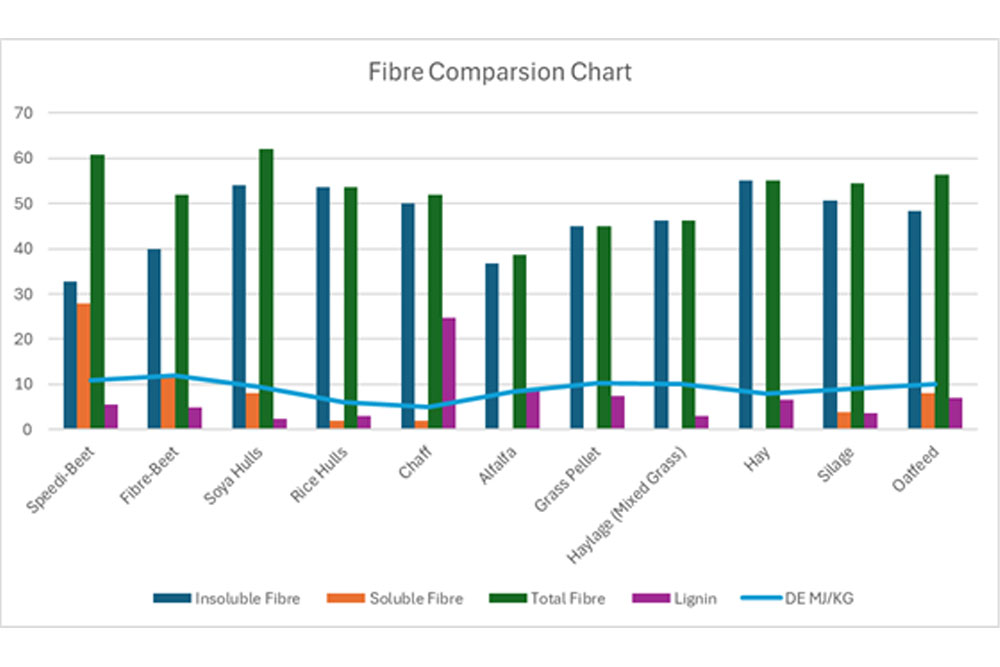 It certainly is not as simple as comparing the crude fibre % on the bag of feed! Remember, horses are hindgut fermenters and therefore feeding a fermentable fibre such as beet pulp will give your horse a higher fibre diet compared to other alternatives.